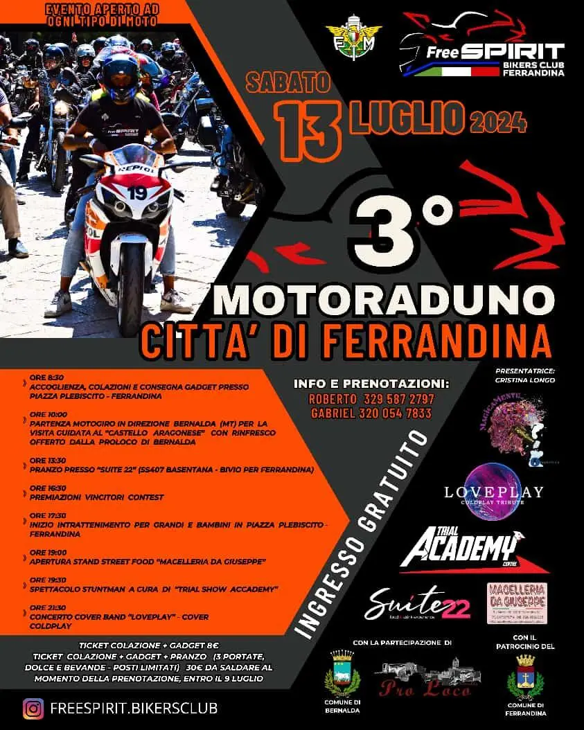 Tutto pronto per il terzo motoraduno a cura dei Free Spirit Bikers club Ferrandina, previsto per il prossimo 13 luglio. Ancora un’edizione ricca di appuntamenti che unisce moto e divertentismo. L’appuntamento è alle 8:30 in Piazza Plebiscito a Ferrandina; momento di accoglienza, colazione e consegna gadget. Prevista per le ore 10:00 la partenza per il motogiro verso Bernalda per una visita guidata al castello aragonese dove a seguire ci sarà un rinfresco offerto dalla Pro Loco di Bernalda. Dopo la pausa pranzo seguirà alle 16:30 la premiazione dei vincitori del contest. Spazio poi all’intrattenimento per tutte le età. Per i più piccoli a cura di Magicamente: mascotte, baby dance e bolle di sapone. In serata apertura degli stand street food con lo spettacolo stuntman a cura di “Trial Show Accademy”. A concludere l’iniziativa il concerto sulle note dei Coldplay, con l'esibizione della cover band “Loveplay”. L’evento è aperto ad ogni tipo di moto. Ingresso gratuito e aperto a tutti per gli appuntamenti previsti nel pomeriggio. L’evento, presentato dalla giornalista Cristina Longo, è patrocinato dal Comune di Ferrandina, dal Comune e dalla Pro Loco di Bernalda.