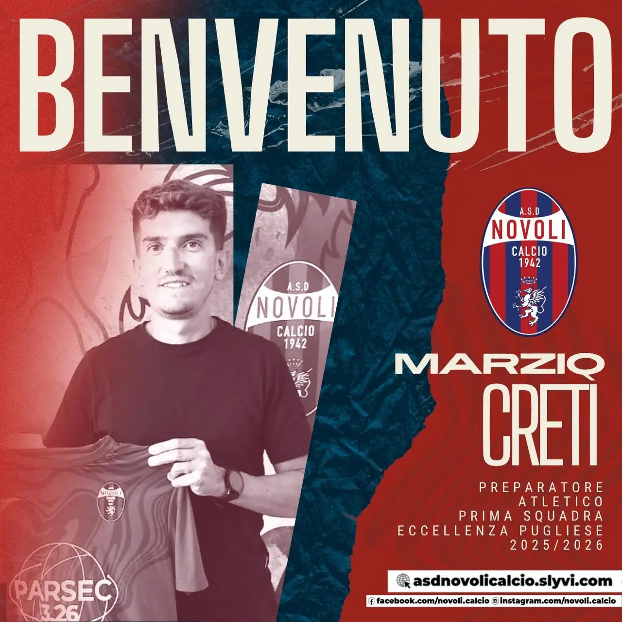 Una novità di prestigio per lo staff tecnico di mister Luperto, che si completa con l'arrivo di Marzio Creti' per il ruolo del preparatore atletico. Un curriculum di tutto rispetto per il professionista brindisino, per la prima volta con i colori #rossoblù dopo le esperienze con le squadre giovanili di Bologna e Lecce, poi con le prime squadre di Brindisi e Nardò nonchè come collaboratore del Centro Federale Tecnico della FIGC. Laureato in Scienze Motorie e Sportive con Magistrale in Scienza e tecnica dello Sport, il professore 33enne è stato abilitato alla qualifica di Preparatore Atletico professionista a Coverciano, scegliendo la causa novolese dopo le stagioni trascorse nei campionati di Serie D e Lega Pro.