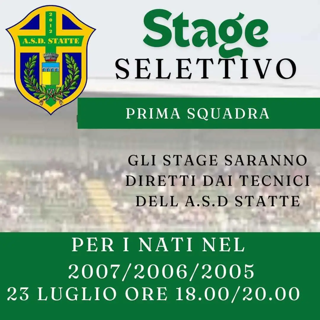 Continua l'estate di stage selettivi dell'ASD Statte del Presidente Giuseppe Russo. Martedì 23 luglio dalle ore 18 alle ore 20, allo stadio “Comunale” di Statte sarà la volta dei ragazzi nati nel 2005, 2006 e 2007 che saranno accolti e visionati dagli attenti occhi di tutto lo staff stattese.