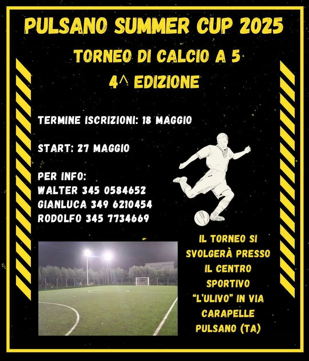 Si avvicina sempre di più la data dell'inizio della quarta edizione della Pulsano Summer Cup grandissimo evento di calcio a 5 che si terrà da martedì 3 giugno presso il rinomato ed elegante Centro Sportivo "L'Ulivo" di Pulsano organizzato al meglio da Walter Novellino, Gianluca Tomaselli e Rodolfo Sampietro. Questo vedrà la partecipazione di ben otto compagini di alta qualità con tanti calciatori di elevato livello tecnico provenienti dal calcio a 11 e da quello a 5 che saranno divise in due gironi. In attesa della riunione tecnica in cui si decideranno i due raggruppamenti ecco ufficializzate le otto formazioni: Onoranze Funebri Turbato, Elettrica Impianti, Studio 23 Il Valentino, Panificio San Francesco, MG Service, Panificio San Giorgio, Nigro SAS, Tapee