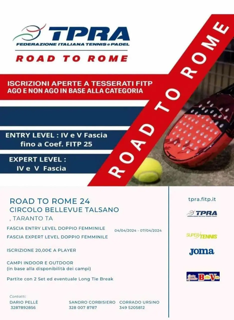 E' tutto pronto presso il Centro Sportivo "Belle Vue" per un altro grandissimo evento di padel denominato "Road to Rome" che si giocherà su campi Indoor e Outdoor (partite con due set ed eventuale Long Tie Break). Il torneo è aperto per le fasce Entry Level IV e V fascia ed Expert Level IV e V fascia (entrambi di doppio femminile). Le iscrizioni per il torneo sono acnora aperte per tesserati FITP agonisti e non agonisti in base alla categoria. Per maggiori info chiamare Dario Pellè al 3287892856, Sandro Corbisiero al 3280078787 o Corrado Ursino al 3495205812.