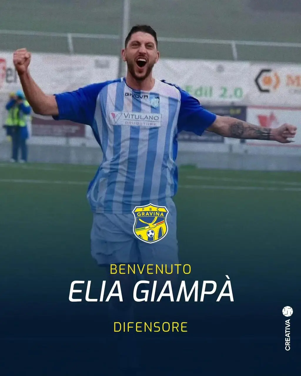 La FBC Gravina comunica l’acquisizione delle prestazioni sportive del calciatore Elia Giampà. Roccioso difensore centrale classe 1998, Giampà è cresciuto nel settore giovanile dell’Empoli. In carriera ha militato nel Siena, Prato, Scandicci e Livorno. Nello scorso campionato si è disimpegnato nella Fidelis Andria prima e nel Manfredonia poi, andando in rete contro il Gravina nella gara di ritorno al “Vicino”.