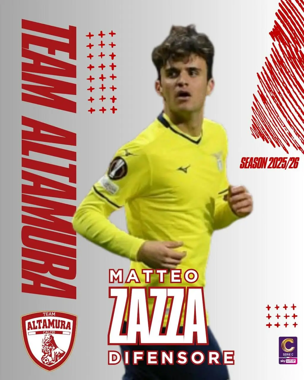 Zazza, classe 2005, proviene dalla Lazio Primavera ed ha firmato con la Società Altamurana un contratto biennale fino al 30/06/2027 con opzione di rinnovo per il terzo anno.