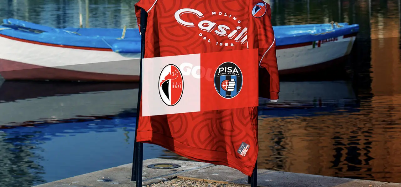 Squadre in campo al San Nicola: Bari in completo bianco con inserti rossi, Pisa in maglia nerazzurra, calzoncini e calzettoni neri con inserti blù.
