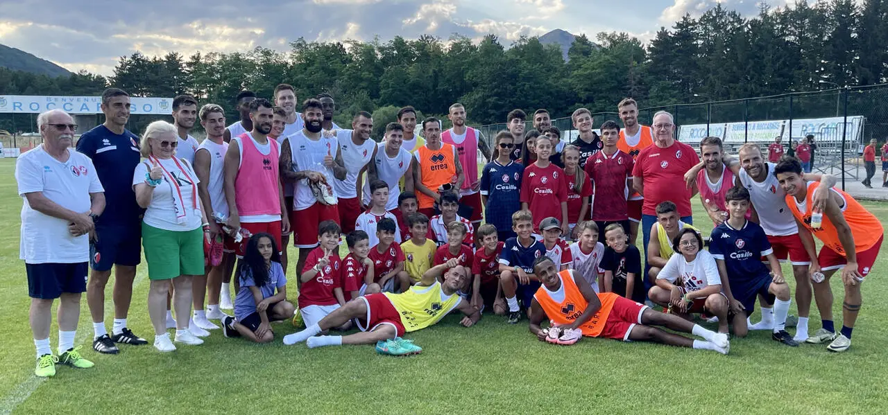 A fine allenamento la squadra ha ricevuto il saluto dei ragazzi della Scuola Calcio Intesa, saliti in Abruzzo per sostenere i biancorossi e godere di qualche giorno di vacanza.