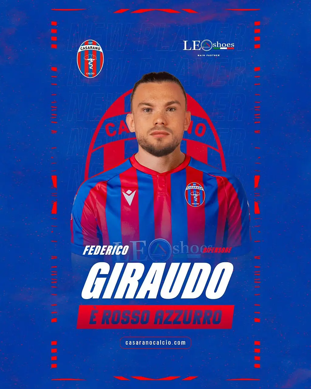 La società Casarano calcio comunica di aver acquisito le prestazioni professionali del calciatore Federico Giraudo, difensore, classe 1998.