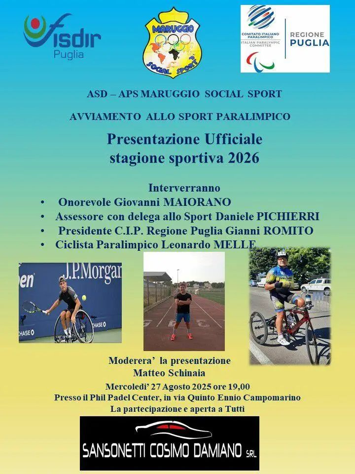 Si terrà mercoledì 27 agostopresso il Phil Padel Center di Campomarino la presentazione ufficiale dell’Avviamento allo Sport Paralimpico promosso dalla ASD – APS Maruggio Social Sport, un progetto che segna l’inizio della stagione 2026 all’insegna di inclusione e nuove opportunità.