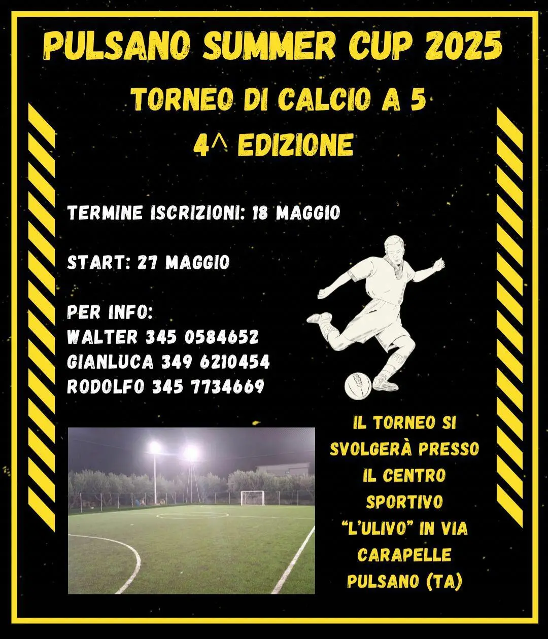 L’attesa è finita: di fatto sono aperte le iscrizioni (ultimo giorno il 18 maggio) per la quarta edizione dell’ormai rinomato e sempre esaltante “Pulsano Summer Cup 2025” grande torneo di calcio a 5 organizzato con immensa passione da Walter Novellino, Rodolfo Sampietro e Gianluca Tomaselli che si disputerà presso il bellissimo Centro Sportivo “L’Ulivo” sito in Via Carapelle a Pulsano. La prima giornata dell’evento è fissata per il 27 maggio.