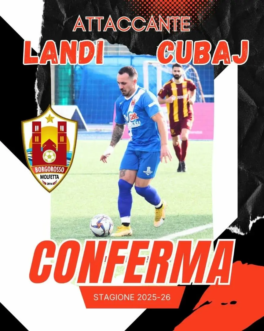 Importante conferma nel reparto offensivo del Borgorosso Molfetta: rinnova l'attaccante 𝗟𝗮𝗻𝗱𝗶 𝗖𝘂𝗯𝗮𝗷, attualmente miglior marcatore all-time della storia del club molfettese con 61 reti complessive messe a segno tra Eccellenza, Promozione e Prima Categoria.