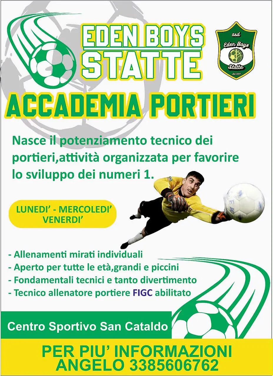 Ancora una bella novità in casa Eden Boys Statte (settore calcio): di fatto nasce l’Accademia portieri con gli allenamenti che si terranno il lunedì, il mercoledì e il venerdì sotto la guida tecnica di Carmelo Ricci (allenatore portieri FIGC ed ex portiere in Categoria). Il corso si terrà presso il Centro Sportivo “San Cataldo” e sarà aperto a ragazzi di tutte le età. Per maggiori informazioni contattare Angelo al 3385606762.