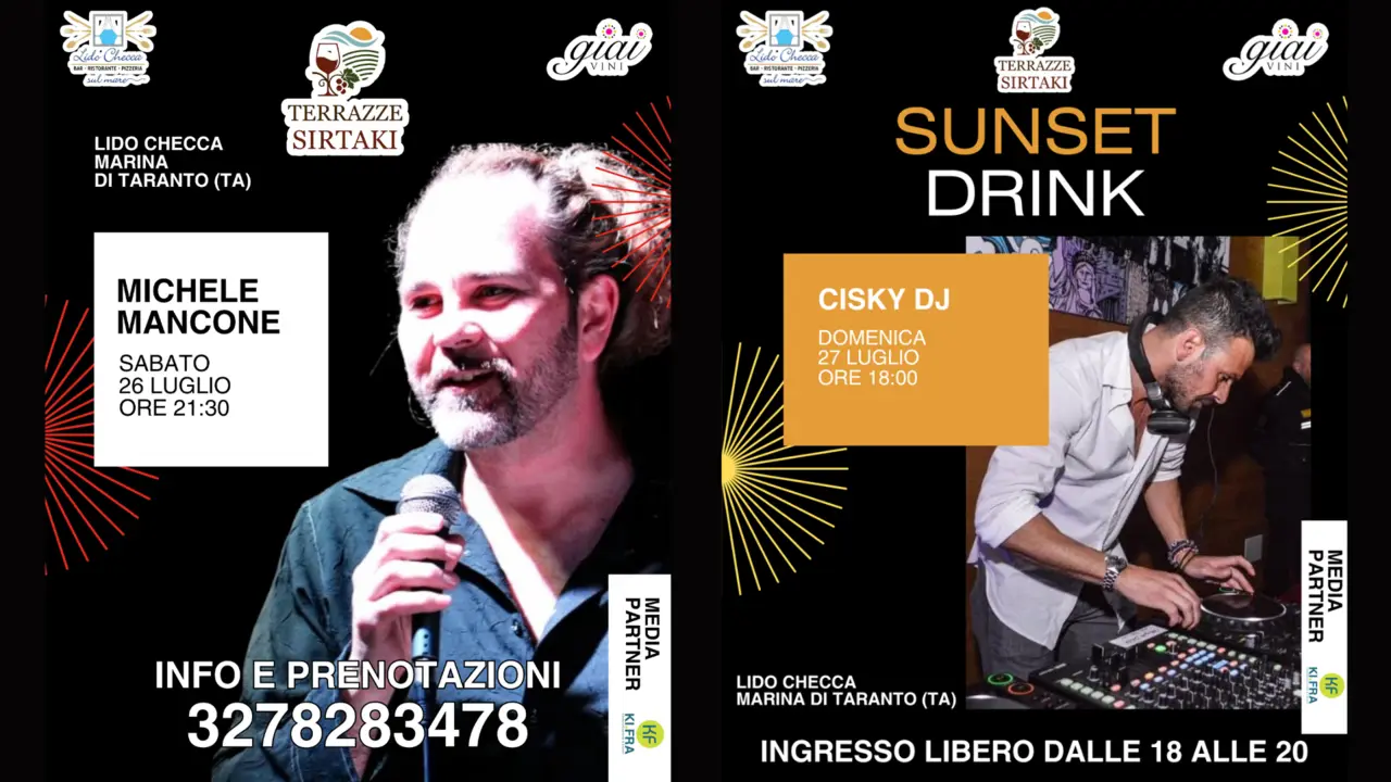 Il prossimo fine settimana, infatti, lo spazio suggestivo del Lido Checca, affacciato sulla Marina di Taranto, ospiterà due eventi che promettono di proseguire la scia di successo delle precedenti serate, ormai diventate punto di riferimento per chi desidera vivere un’esperienza raffinata e rilassante a pochi passi dal mare.