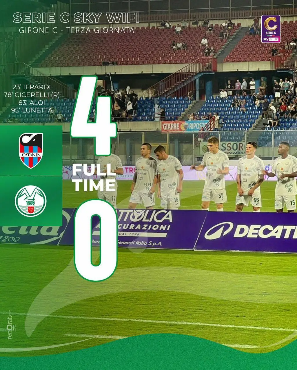 Marcatori: 23’ pt Ierardi (Cat), 33’ st Cicerelli su rigore (Cat), 38’ st Aloi (Cat), 50’ st Lunetta (Cat)