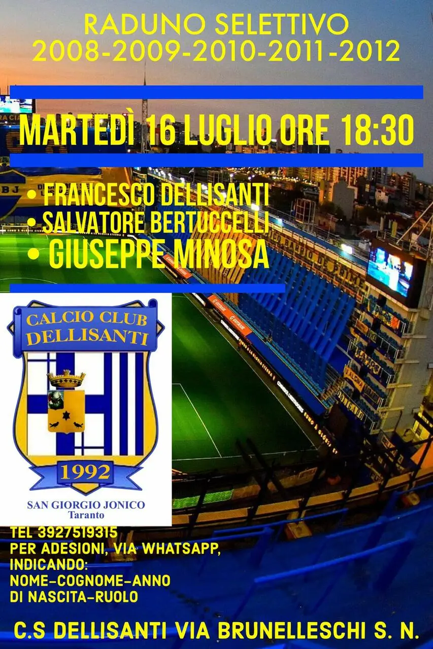 In casa Calcio Club Dellisanti si continua con i raduni selettivi: martedì 16 luglio a partire dalle ore 19:30, presso il Centro Sportivo "Dellisanti" ce ne sarà un secondo per ragazzi nati nel 2008, 2009, 2010, 2011 e 2012 che saranno visionati e seguiti dagli espertissimi tecnici Francesco Dellisanti, Salvatore Bertuccelli e Giuseppe Minosa. Per maggiori info chiamare il 3927519315.