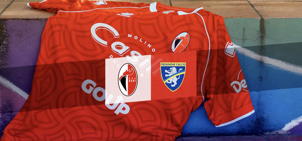 Squadre in campo al San Nicola: Bari in completo bianco con inserti rossi, Frosinone in completo blù scuro con inserti gialli.