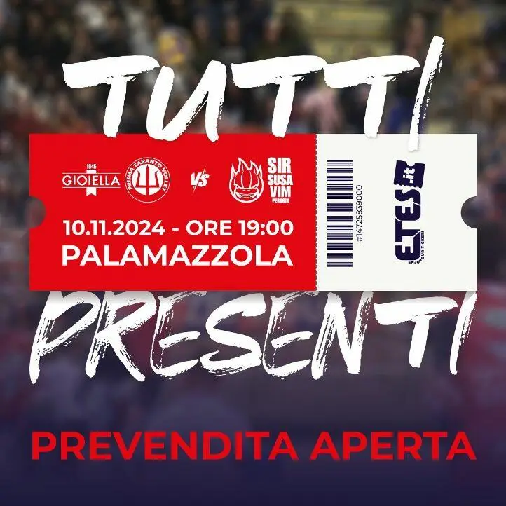 La Gioiella Prisma Taranto Volley comunica che dalle ore 09:00 del 30 ottobre 2024 sarà attiva la prevendita dei tagliandi relativi all’incontro valevole per la settima giornata di Superlega Credem Banca 2024\25 contro la Sir Susa Vim Perugia . L’incontro si terrà Domenica 10 Novembre 2024 alle ore 19.00 presso il Palamazzola.