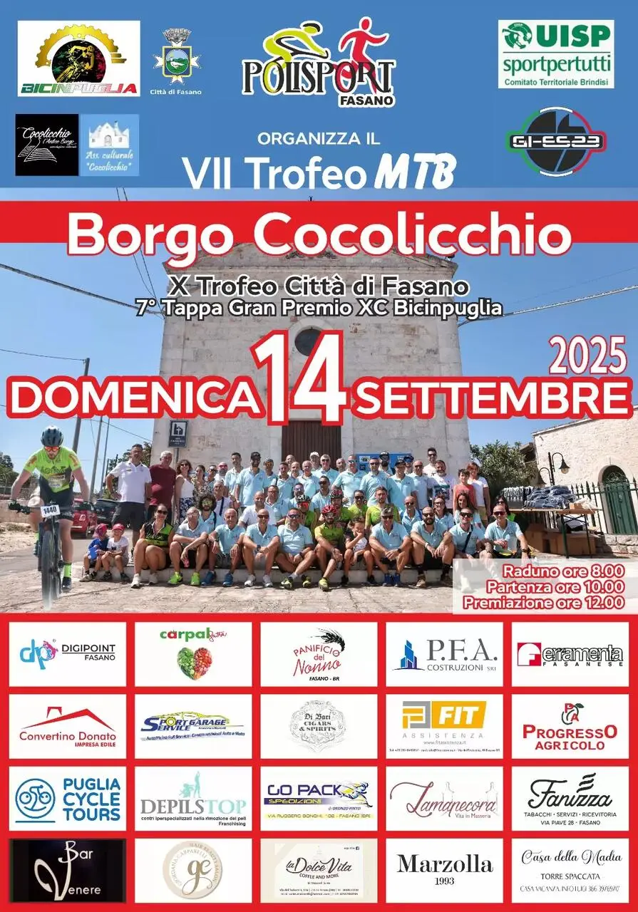 La grande mountain bike fa tappa a Fasano con il Trofeo Borgo Cocolicchio, in programma domenica 14 settembre 2025 nella suggestiva località fasanese. L’evento, organizzato dalla Polisport Ciclo Club Fasano con il supporto dei comitati UISP di Taranto, Valle d’Itria e Brindisi, vedrà protagonisti i cicloamatori tesserati per UISP, FCI e altri enti della Consulta, tutti regolarmente in possesso di certificato medico agonistico per il ciclismo.