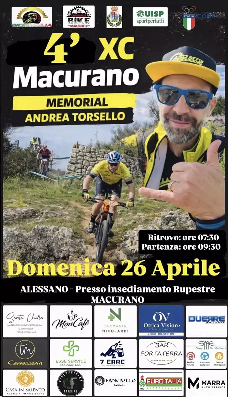 Ad Alessano torna protagonista la mountain bike con la XC Macurano – Memorial Andrea Torsello, appuntamento inserito come 3ª tappa del Challenge Bike Salento 2026 UISP, in programma domenica 26 aprile e organizzato dalla ASD MTB Alessano, realtà sempre più punto di riferimento per il movimento MTB del territorio .