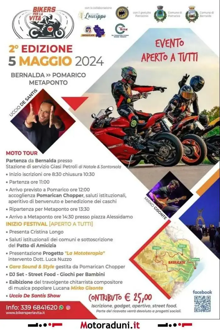 Dopo il successo della prima, ritorna il 5 maggio con tanta attesa la seconda edizione di Bikers per la vita 2024. Il programma prevede due fasi. A dare il via sarà un moto tour che parte da Bernalda fino a Pomarico con rientro a Metaponto Lido in piazza Alessidamo dove si darà il via al festival aperto a tutti: amanti delle due ruote e non, comprese famiglie che desiderano trascorrere una domenica pomeriggio all’insegna del divertimento e non solo. Il festival si aprirà con i saluti da parte delle istituzioni patrocinanti l’evento, il Comune di Bernalda ed il Comune di Pomarico, tra i quali si stringerà ufficialmente il Patto di Amicizia promosso dall’Associazione “Bikers per la vita”. Per l’occasione verrà presentato anche il progetto di Mototerapia a cura di Luca Nuzzo, terapista delle neuro e psicomotricità dell’età evolutiva, tecnico del comportamento RBT, fondatore e responsabile scientifico dell’associazione “La MotoTerapia”. L’evento sostiene il progetto sociale “Scopri il mio mondo” costituito da una serie di iniziative promosse e gestite direttamente dall’associazione Bikers per la vita, volte a sensibilizzare e far conoscere il mondo dell’autismo e le problematiche del neurosviluppo. Al fine di scoprire il sound più unico, ma anche emozionante che donerà dopo una sinfonia di potenza, quell’adrenalina in più agli amanti delle due ruote, si darà spazio alla gara Sound & Style gestita da Pomarican Chopper, dove anche sullo stile maggiore si avranno gli occhi puntati. Non poteva che non mancare un momento musicale di puro divertimento per tutti che vede esibirsi un DJ Set e l’esibizione del talentuoso Mirko Gisonte, chitarrista e compositore lucano che travolgerà i presenti nelle note della musica popolare. Divertimento anche per i più piccini che saranno impegnati in svariati giochi. Sarà presente nella piazza anche un’area street food. A concludere l’evento lo spettacolo dell’attore, comico e cabarettista italiano, Uccio De Santis. Presenterà l’evento la giornalista Cristina Longo.