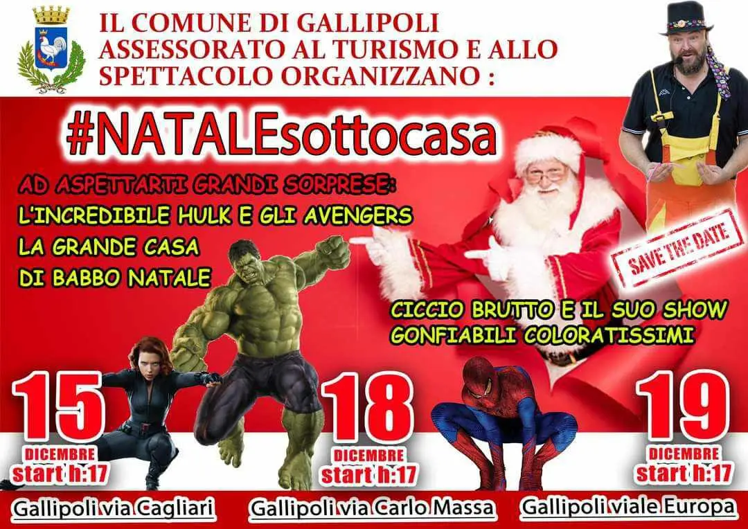 Ancora tre super date per conoscere e scattare tante foto con i mitici personaggi di Giò Giò e i Supereroi. Di fatto il 15, il 18 e il 19 saranno a Gallipoli in occasione dell'evento "#Natalesottocasa", Nella prima delle tre date saranno presenti Iron Man, Thor e la Vedova Nera; nella seconda (in Via Carlo Massa) Ghost Spider, Spider Man e War Machine mentre nella terza ed ultima (in Viale Europa) Iron Man, la Vedova Nera e Captain America. Per le occasioni presente anche Ciccio Brutto e il suo Show oltre alla presenza di gonfiabili per far divertire i bambini. Non mancate...