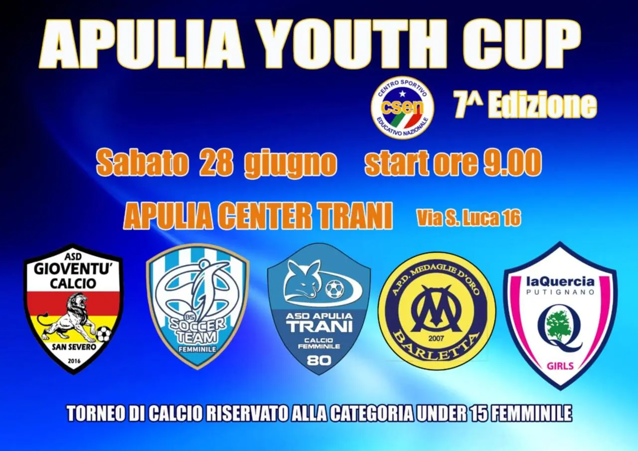 Per molti sono già iniziate le vacanze estive ma non per l’Apulia Trani che organizza un altro grandissimo evento di calcio femminile per la categoria U15. Si tratta della settima edizione dell’Apulia Youth Cup che si terrà sabato a partire dalle ore 9:00 presso la fantastica struttura dell’Apulia Center, quartier generale del club tranese dotato, tra l’altro di piscina. Una grande soddisfazione per la società biancoazzurra che per l’occasione è riuscita a portare importanti squadre da un po’ tutte le zone della Regione Puglia. Di fatto vi parteciperanno la Gioventù Calcio di San Severo, la Soccer Team, l’A.P.D. Medaglie D’oro Barletta e La Quercia Putignano.
