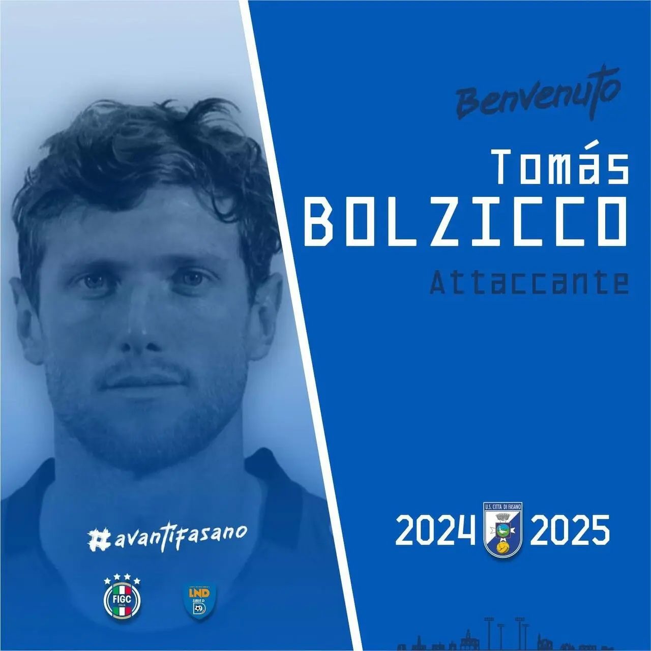 L’US Città di Fasano ufficializza il primo attaccante della rosa che si appresta ad affrontare la Serie D 2024/25: si tratta del ventinovenne argentino Tomàs Bolzicco. Alto 1,88 cm e destro di piede, la punta albiceleste, cresciuta nel CA Uniòn di Santa Fe (debuttando a 19 anni nel massimo campionato), ha giocato in patria anche con lo Sportivo AC, il JJ Urquiza, il CA Villa San Carlos e l’Estudiantes, in Cile con l’Uniòn La Calera, il Bolivia con il Club Aurora ed in Ecuador con il CD Macarà.