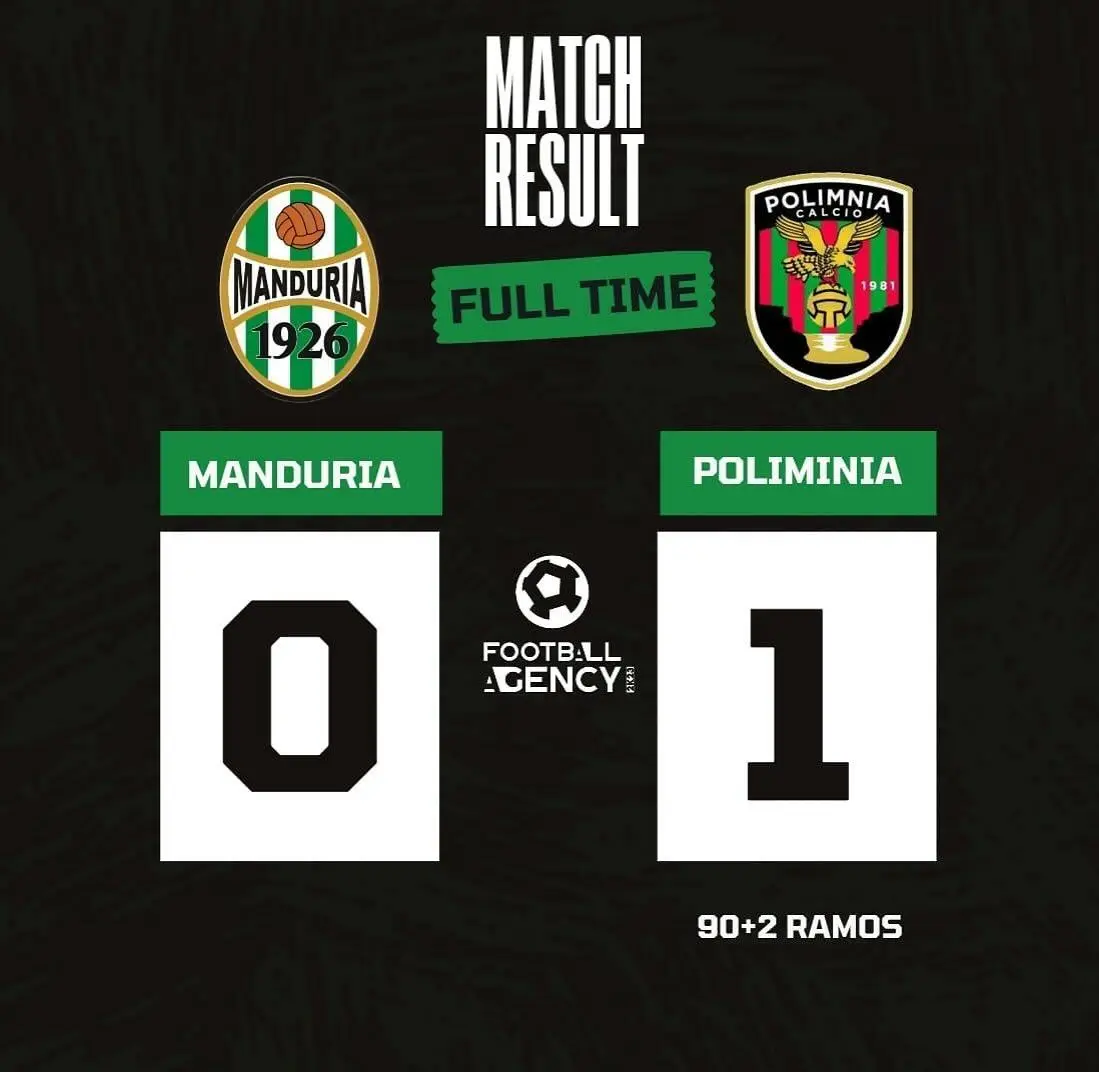 Manduria in dieci dal 26’ della ripresa beffato al secondo minuto di recupero. Malgrado i ragazzi biancoverdi abbiano creato la maggior parte delle occasioni, non sono riusciti a concretizzare subendo un goal nei minuti di recupero. Un pareggio sarebbe stato sicuramente un risultato più equo. A rendere la vita difficile ai padroni di casa è intervenuta l’espulsione di Chiochia al 26’ della ripresa per doppia ammonizione. Per quanto riguarda la cronaca, il Manduria parte subito a testa bassa e primeggia per tutta la prima frazione di gioco mettendo alle corde gli avversari al 3’ e al 19’ su tentativo di Achik. Al 39’ doppia opportunità per i biancoverdi dapprima con De Sagastuzabal, sulla respinta di Lonoce replica Hachik il cui tiro si perde di poco sul fondo. La prima fase si chiude con un bolide di Cutrone da 25 metri che impegna Lonoce. Nel secondo tempo il Manduria insiste e al 9’ Hachik crossa al centro per De Sagastizabal che spedisce di poco fuori. Al 26’ padroni di casa in dieci, a seguito dell’espulsione di Chiochia per doppia ammonizione. Il Manduria costretto pertanto in difesa, cerca di arginare le folate degli avversari che si fanno più intraprendenti e al 47’ vanno in vantaggio, punizione di Loseto con palla che schizza sulla traversa e torna in campo, interviene di testa Ramos e segna il goal della vittoria per i baresi.