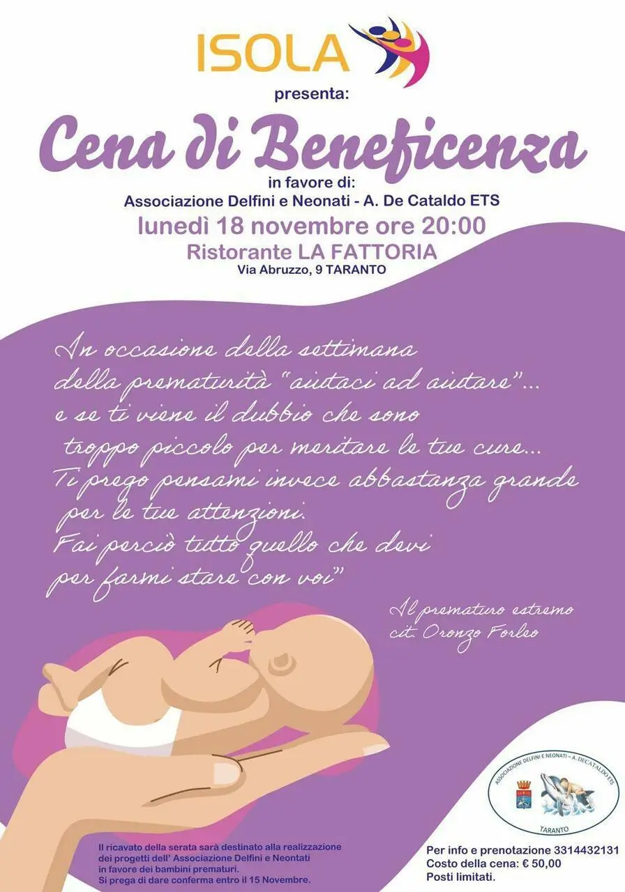 È targata Isola cooperativa sociale questa nuova iniziativa ad opera del Presidente Paolo Vinci e del Vicepresidente Daniela Riccardo in favore dell’Associazione Delfini e Neonati , l’evento che avrà luogo il 18 novembre 2024 alle ore 20 presso il Ristorante la Fattoria vuole raggiungere e coinvolgere quante più persone che hanno come unico obiettivo : stare insieme in una serata ricca di sorrisi che fanno bene al cuore e che tanto servono alla UTIN di Taranto , infatti una parte del ricavato della cena sarà devoluto all’Associazione che si occuperà dell’acquisto di beni strumentali diagnostici utili per esami neonatali effettuati nel Reparto di Terapia Intensiva Neonatale.