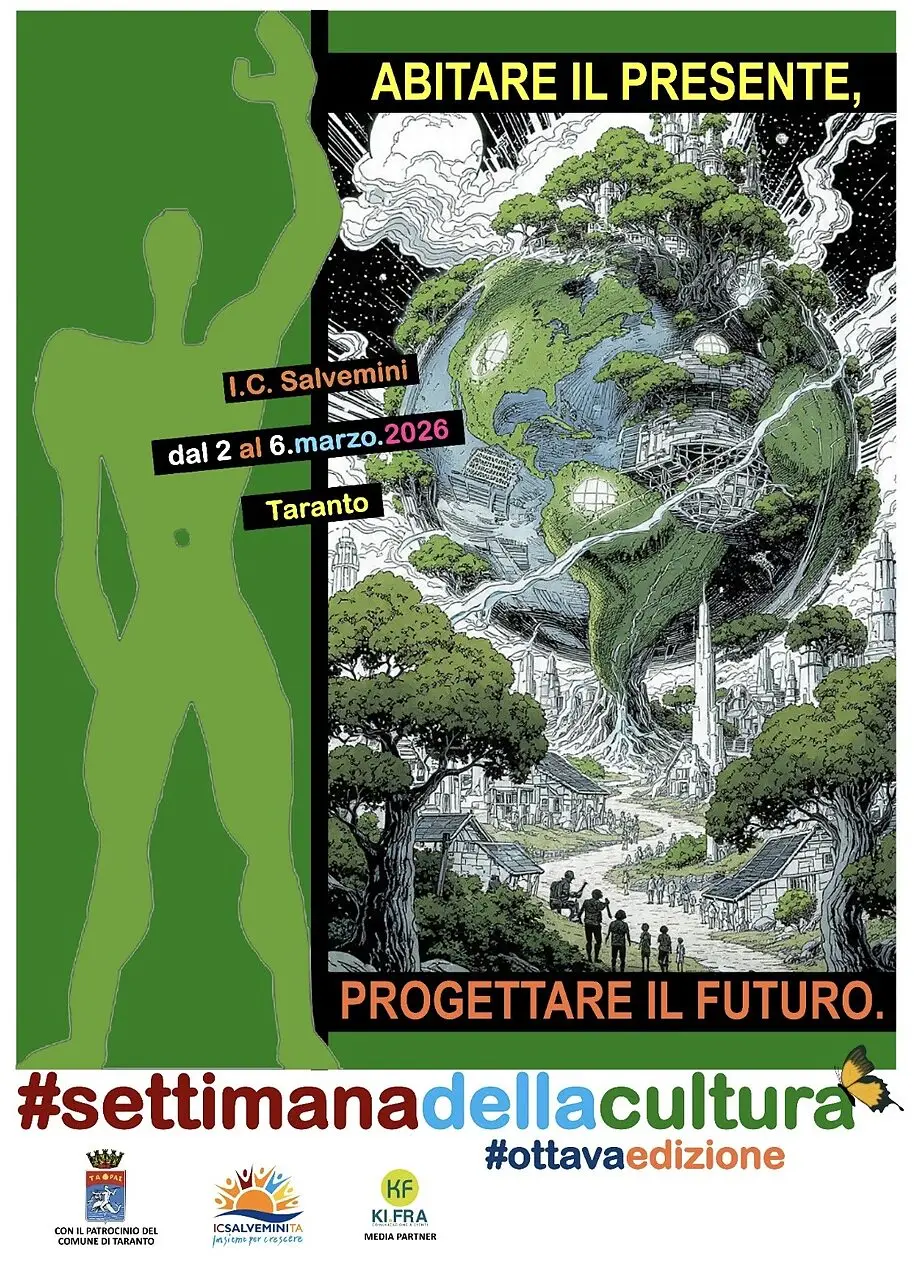 Torna dal 2 al 6 marzo 2026, presso l’Istituto Comprensivo “G. Salvemini” di Taranto, l’attesa ottava edizione della “Settimana della Cultura”, prestigioso appuntamento inserito nel PTOF e patrocinato dal Comune di Taranto, che quest’anno si sviluppa attorno al tema “Abitare il presente, progettare il futuro”, in linea con l’Obiettivo 11 dell’Agenda ONU 2030, dedicato alle città e comunità sostenibili.