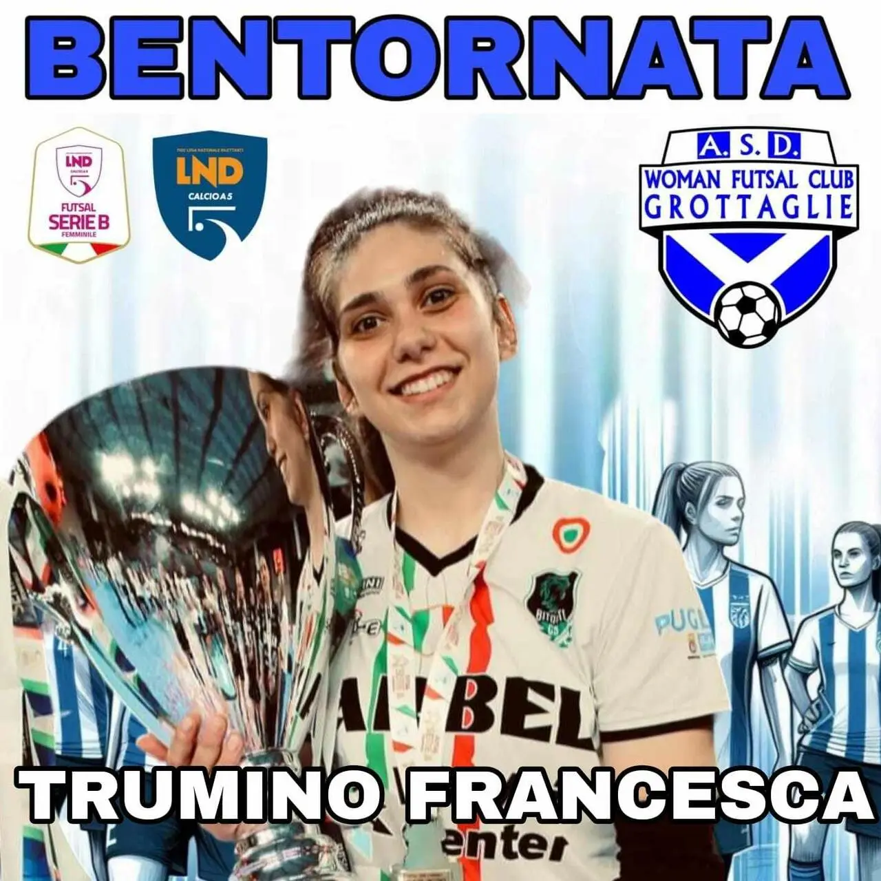 Un grande ritorno in casa WFC Grottaglie con la società biancoazzurra che riabbraccia il forte portiere Francesca Trumino che nell'ultima stagione ha vestito la maglia del Futsal Bitonto laureandosi campione d’Italia e vincendo la coppa Italia e la Supercoppa italiana.