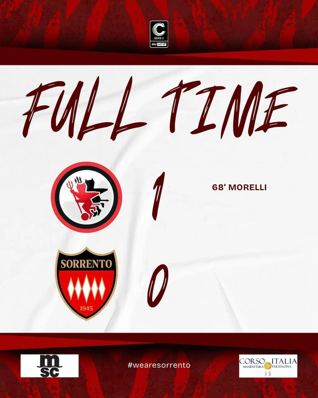 Sorrento (3-5-2): Harrasser; Carrillo, Solcia, Fusco; Riccardi, Franco, Cangianiello, Cuccurullo (64’ Vilardi), Crecco (71’ Esposito); D’Ursi (64’ Potenza), Plescia. A disp.: Boccarusso, D’Aniello, Shaw, Di Somma, Ricercato, Piras, Matera, Colombini, Russo, Tonni. All.: Mirko Conte.