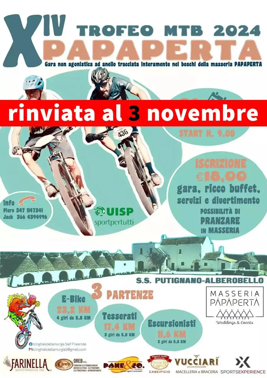 Dopo il rinvio dello scorso 20 ottobre a causa del maltempo, è ormai tutto pronto per la quattordicesima edizione del Trofeo Masseria Papaperta, organizzatod al team I Cinghiali della Murgia in collaborazione con la Uisp Puglia.