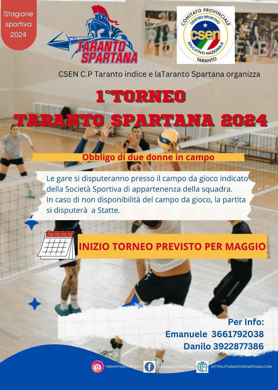 È tutto pronto per un nuovo grande evento di volley targato ASD Taranto Spartana. In collaborazione con CSEN di fatto l'Associazione ionica organizza un torneo di pallavolo con l'obbligo di due donne in campo che avrà inizio nel mese di maggio. Per maggiori informazioni contattare Emanuele al 3661792038 o Danilo al 3922877386.