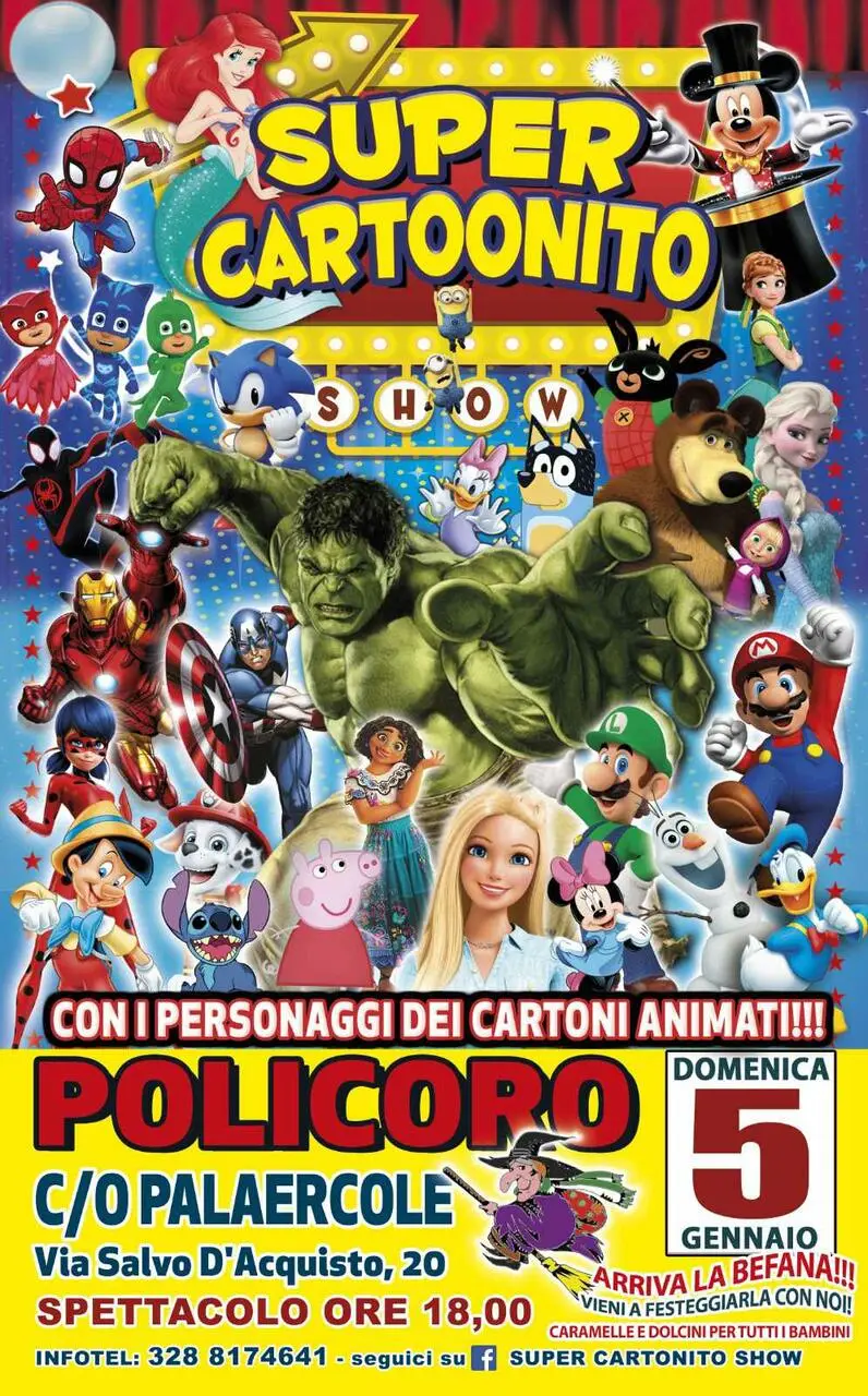 Il 5 gennaio, in occasione della vigilia dell’Epifania, al PalaErcole di Policoro (a partire dalle ore 18:00) arriva Super Cartoonito con i personaggi dei cartoni animati. Tra questi ci saranno anche Hulk e Iron Man dell’Associazione Giò Giò e i Supereroi. Quindi una nuova grande occasione per conoscerli, divertirsi e scattare foto insieme a loro chiudendo le feste natalizie nel migliore dei modi e con il sorriso.