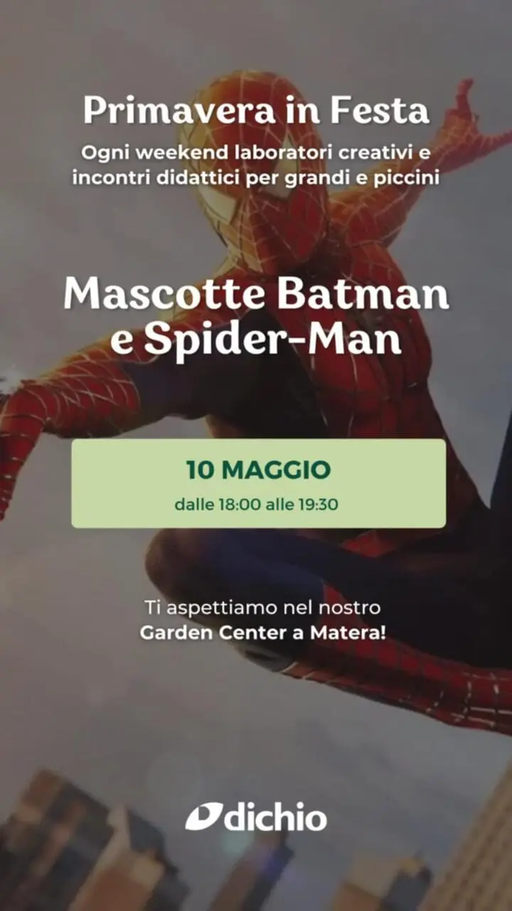 Ancora un grande evento per l’Associazione Giò Giò e i Supereroi che sabato 10 maggio, dalle 18:00 alle 19:30 presso il Dicho Garden Center di Matera (nei pressi del Centro Commerciale Mongolfiera Matera Venusio, SS 99) con Batman e Spider Man animeranno il pomeriggio facendo divertire tutti i presenti e scattando tante foto. Non mancate…