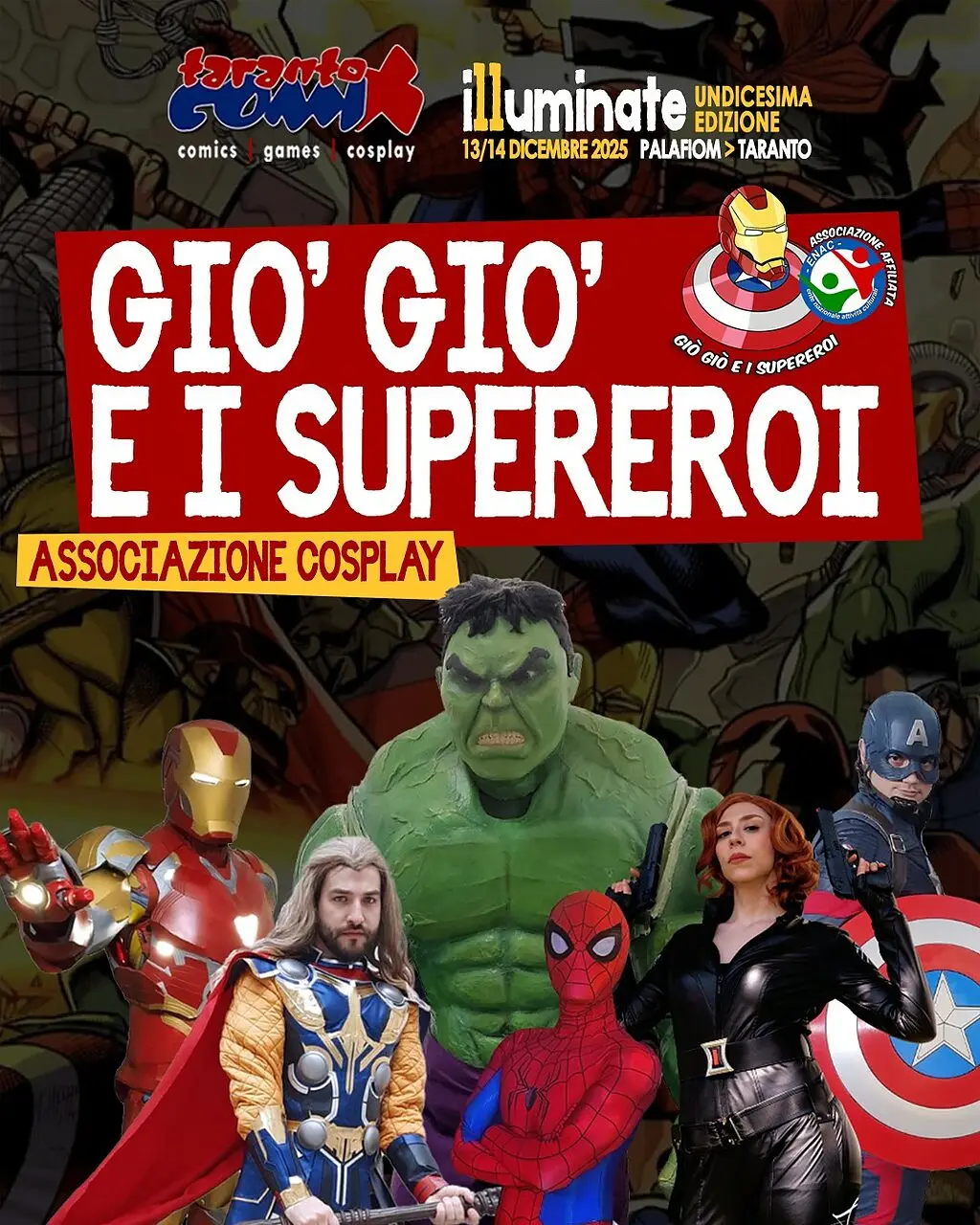 Ancora un grande appuntamento con l’Associazione Gio’ Gio’ e i Supereroi che nei giorni 13 e 14 dicembre sarà al Palafiom per il Taranto Comix con uno stand in cui si potranno ammirare da vicino i costumi, scattare foto con il gigantesco Hulk e assistere a due spettacoli. Una grande occasione per divertirsi: perciò non mancate!
