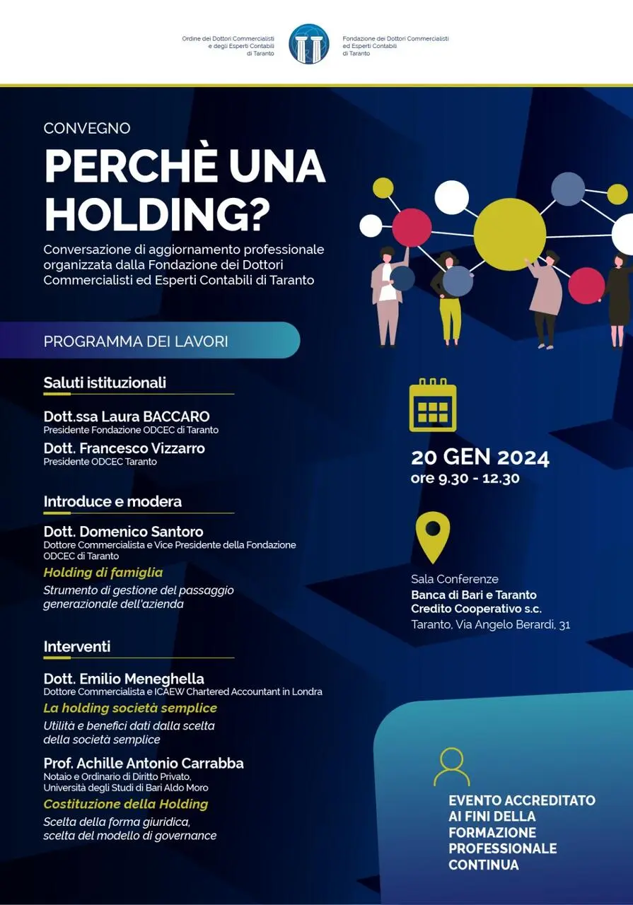 Si terrà a Taranto sabato 20 gennaio con inizio alle nove e trenta la conversazione di aggiornamento professionale dal titolo «Perché una holding?». L’incontro -di sicuro interesse per commercialisti, avvocati, notai, private banker ed imprenditori- sarà ospitato nella sala conferenze della Banca di Bari e Taranto Credito Cooperativo, ed è organizzato dalla locale Fondazione dei Dottori Commercialisti ed Esperti Contabili. Per comprendere la importanza ed attualità della materia basti dire che i Paesi membri dell’Unione Europea e non, da anni si contendono la attrattività della propria giurisdizione quale sede legale delle società holding, in molti casi arrivando a concedere tassazione pari a zero per i dividendi che la holding stessa riceve dalle sue partecipate (è il caso, ad esempio, di Belgio, Cipro, Danimarca, Irlanda, Lussemburgo, Malta, Olanda, Spagna, Svezia e Regno Unito). In Italia la cosiddetta holding di famiglia, i cui soci sono appartenenti alla medesima famiglia, costituisce una tipologia di holding particolarmente importante ed è in assoluto la più diffusa. In completa armonia con il tessuto economico e produttivo della nazione, che è in gran parte costituito da imprese a guida familiare, moltissime delle quali di dimensione piccola o media. La holding di famiglia rappresenta anche una soluzione valida al sempre attuale problema del passaggio generazionale, offrendo vantaggi quali la possibilità di gestire il passaggio riducendo al minimo le conflittualità familiari, che sono spesso causa di rallentamenti –se non addirittura di paralisi– dell’attività aziendale. Ad esempio, pianificare il trasferimento della proprietà azionaria e della responsabilità gestionale di un’azienda attraverso lo strumento della holding consente di separare gli interessi degli eredi concretamente interessati e preparati a misurarsi con la gestione dell’impresa, da quelli di chi guarda ai soli redditi derivanti dalla detenzione di azioni o quote, ma non in grado di partecipare alle scelte gestionali. Tra le cento più ricche famiglie imprenditoriali italiane, il ricorso alla holding per “regnare” sul gruppo aziendale sottostante è un must: la famiglia Benetton(Luciano, Giuliana, Gilberto e Carlo) ha messo a capo dei loro diversi investimenti la holding Edizione Srl. Antonio Percassi (padre di sei figli) è a capo della holding Odissea Srl, attiva nel settore immobiliare e negli outlet. L’elenco potrebbe continuare quasi senza fine. Dopo i saluti istituzionali del Presidente della Fondazione dei Dottori Commercialisti ed Esperti Contabili di Taranto Laura Baccaro e del Presidente dell'Ordine dei Dottori Commercialisti ed Esperti Contabili di Taranto Francesco Vizzarro, interverranno in qualità di relatori all’evento, accreditato ai fini della formazione dei professionisti contabili: Achille Carrabba(Notaio), Domenico Santoro (Dottore Commercialista) ed Emilio Meneghella (Chartered Accountant).
