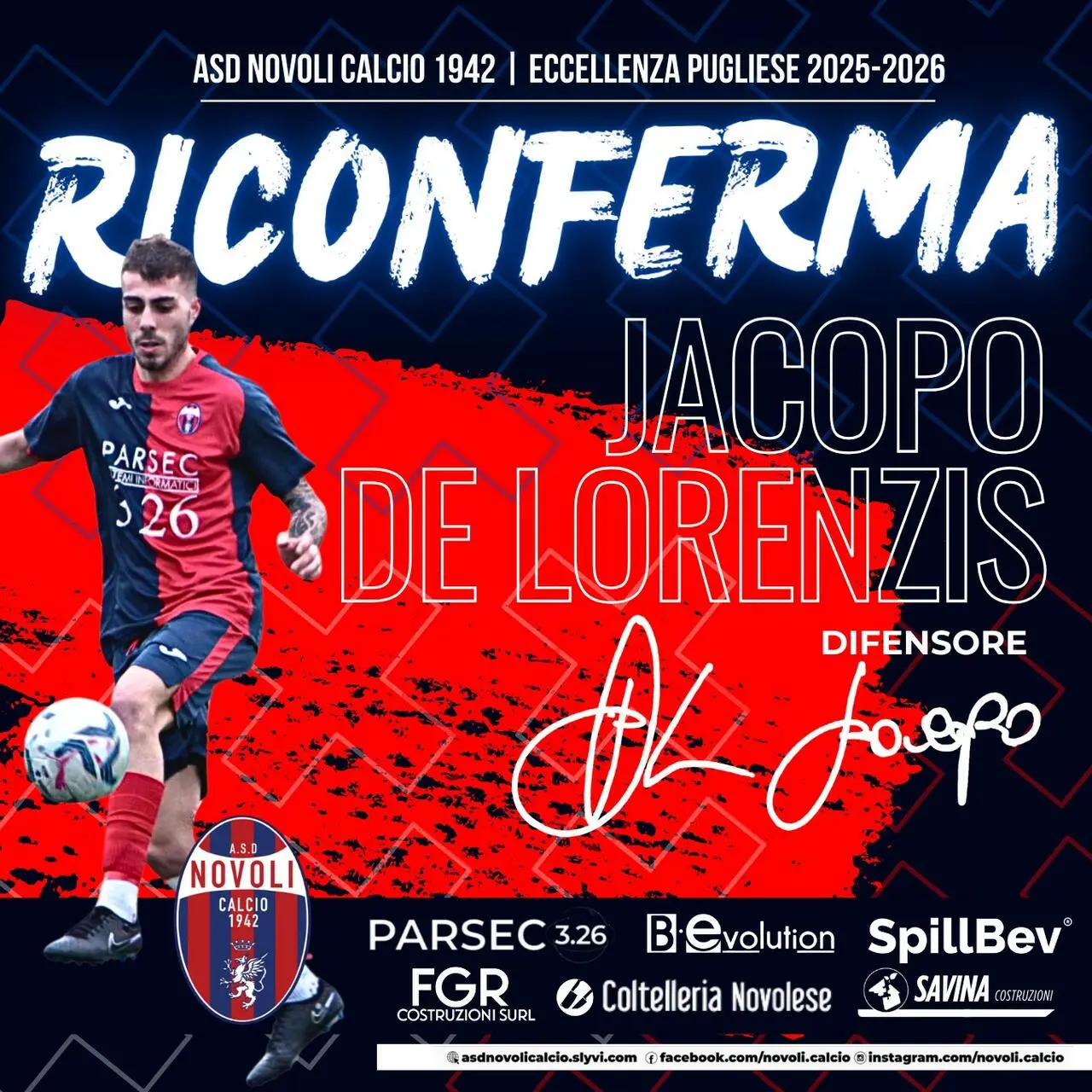 Ripartire, riscattarsi, riprendere in mano il proprio destino. Tre imperativi che 𝑱𝒂𝒄𝒐𝒑𝒐 𝑫𝒆 𝑳𝒐𝒓𝒆𝒏𝒛𝒊𝒔 ha espresso all'inizio di questa nuova stagione, dopo che la scorsa si è caratterizzata per sfortuna ed eventi avversi, ma ha di fatto rafforzato il legame con la maglia del Novoli Calcio. Valori inediti, come la pazienza e la costanza, la fedeltà e la vicinanza, che Jacopo ha dimostrato fuori dal campo in una stagione maledetta ma comunque da ricordare, se non altro perchè ha dato l'input per la #riconferma e ha aperto nuovamente le porte del rettangolo verde per il giovane difensore, ancora in maglia #rossoblù.