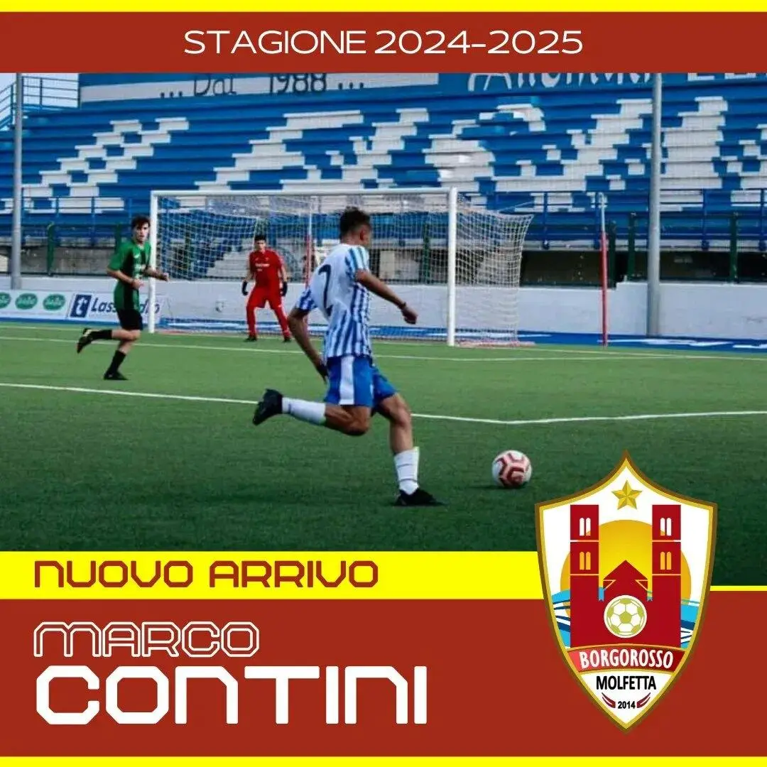 Il giovane terzino 𝗠𝗮𝗿𝗰𝗼 𝗖𝗼𝗻𝘁𝗶𝗻𝗶 ha firmato con il Borgorosso Molfetta. Esterno della corsia di destra e classe 2005, nella scorsa stagione ha giocato con la Molfetta Calcio, rientrando anche nel giro della prima squadra. Nel campionato precedente, invece, si è distinto con il Fasano: «Mi sento pronto per questo nuovo inizio e sono felice di essere arrivato in una squadra giovane come questa. Ci toglieremo belle soddisfazioni». 𝐁𝐞𝐧𝐯𝐞𝐧𝐮𝐭𝐨!