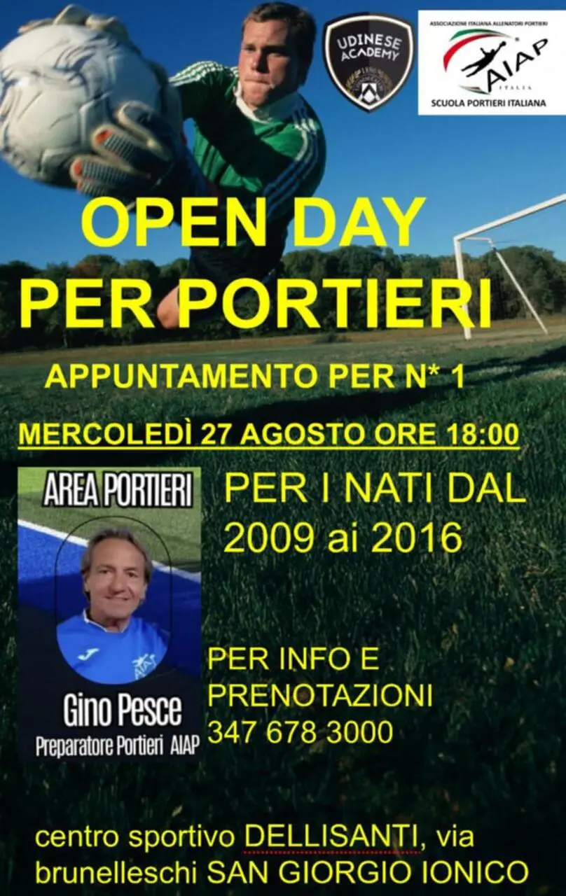 La nuova stagione è alle porte così come anche il primo grande appuntamento aperto a tutti i ragazzi nati dal 2009 al 2016 organizzato dall'AIAP che si terrà mercoledì 27 agosto al Centro Sportivo Dellisanti di San Giorgio. Per maggiori informazioni contattare il preparatore dei portieri AIAP Gino Pesce al 3476783000.