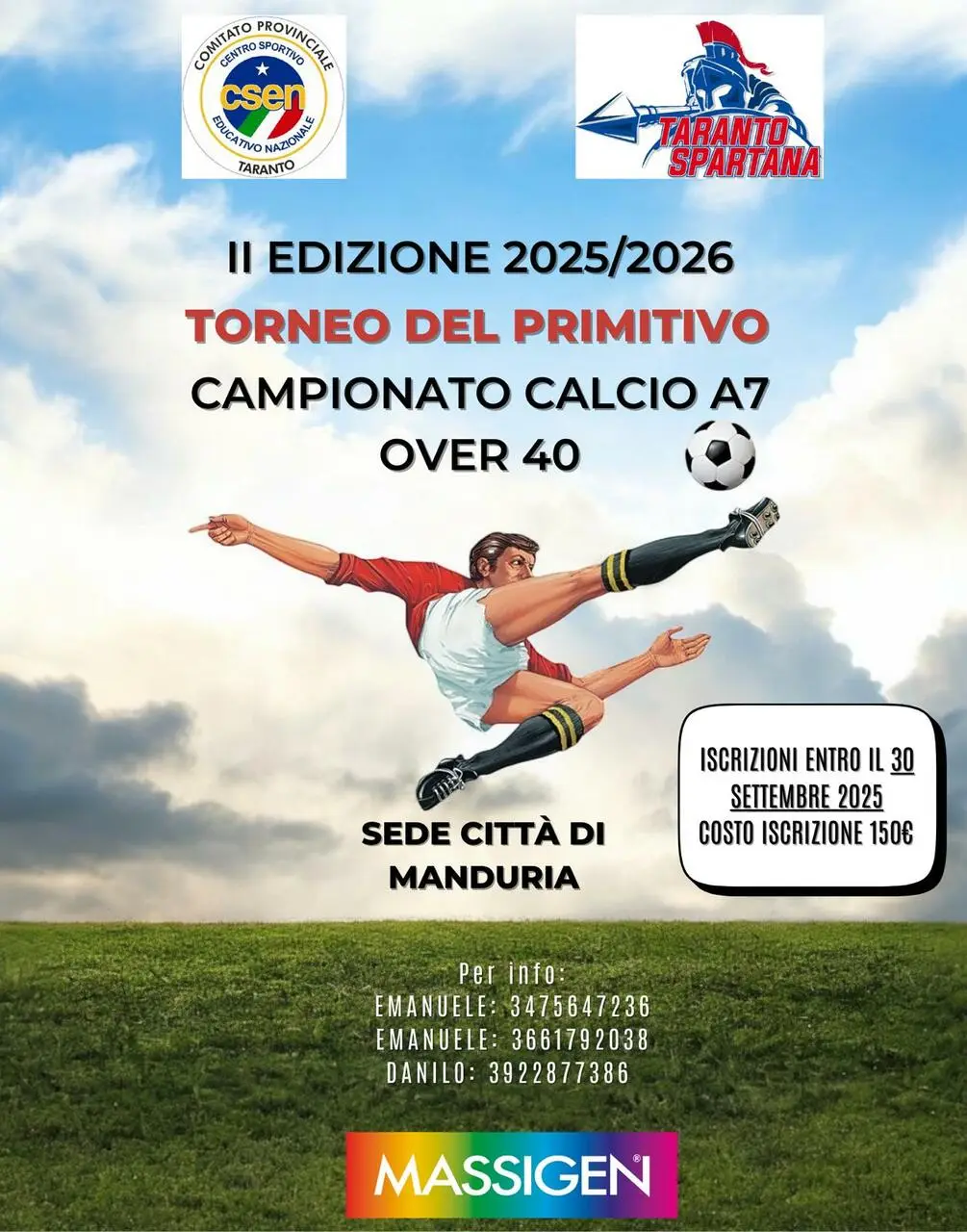 Si prospetta una stagione ricca di grandi emozioni e di grande calcio: tutto ciò grazie al grande impegno dell'ASD Taranto Spartana (affiliata CSEN) che organizza, a Manduria, la seconda edizione del "Torneo del Primitivo" campionato di calcio a 7 Over 40. Le iscrizioni resteranno aperte fino al 30 settembre al costo di 150 euro a squadra.