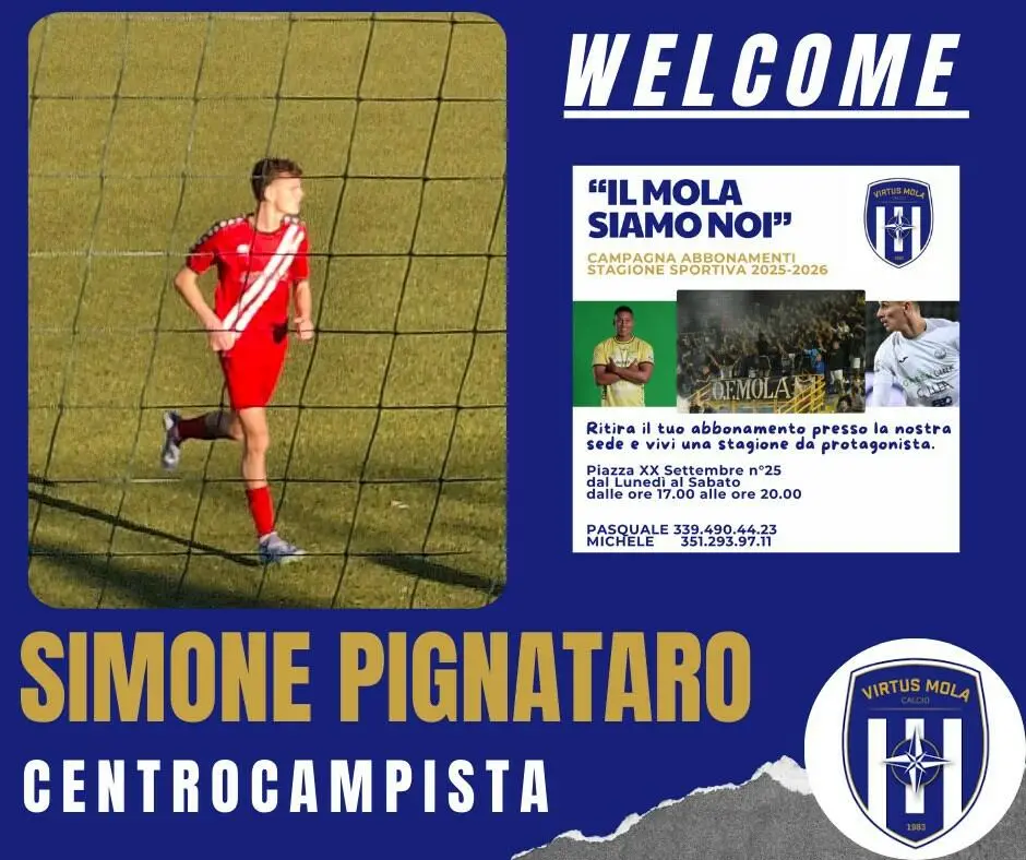 La qualità è quello che il nostro DS cerca nei giovani calciatori. Simone Pignataro ne ha tanta e siamo lieti di annunciare che finalmente è della Virtus Mola. Da oggi in rosa, il classe 2007 ben si è distinto nella scorsa stagione indossando la maglia del Team Altamura con cui ha disputato il campionato Primavera. Benvenuto, Simone.