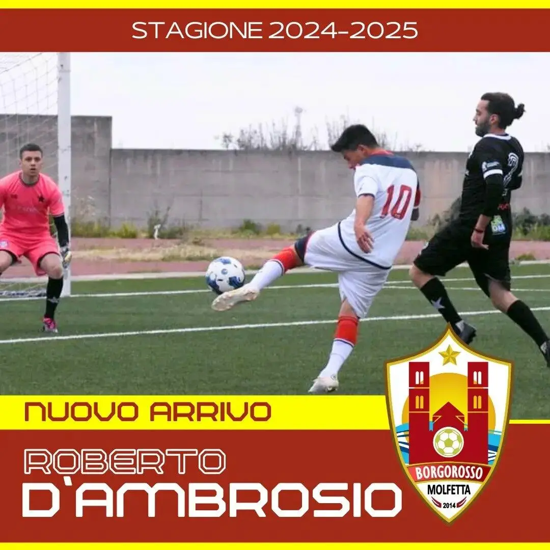 Innesto nel reparto offensivo per il Borgorosso Molfetta che ufficializza la firma di 𝗥𝗼𝗯𝗲𝗿𝘁𝗼 𝗗'𝗔𝗺𝗯𝗿𝗼𝘀𝗶𝗼, esterno alto classe 1997 con ottimi numeri dal punto di vista realizzativo nelle ultime stagioni. Ha giocato la primissima parte di campionato con la maglia dell'Oraziana Venosa in Eccellenza lucana ma è reduce da due promozioni consecutive dalla Prima Categoria con le maglie del Maracanà San Severo e del Canusium.