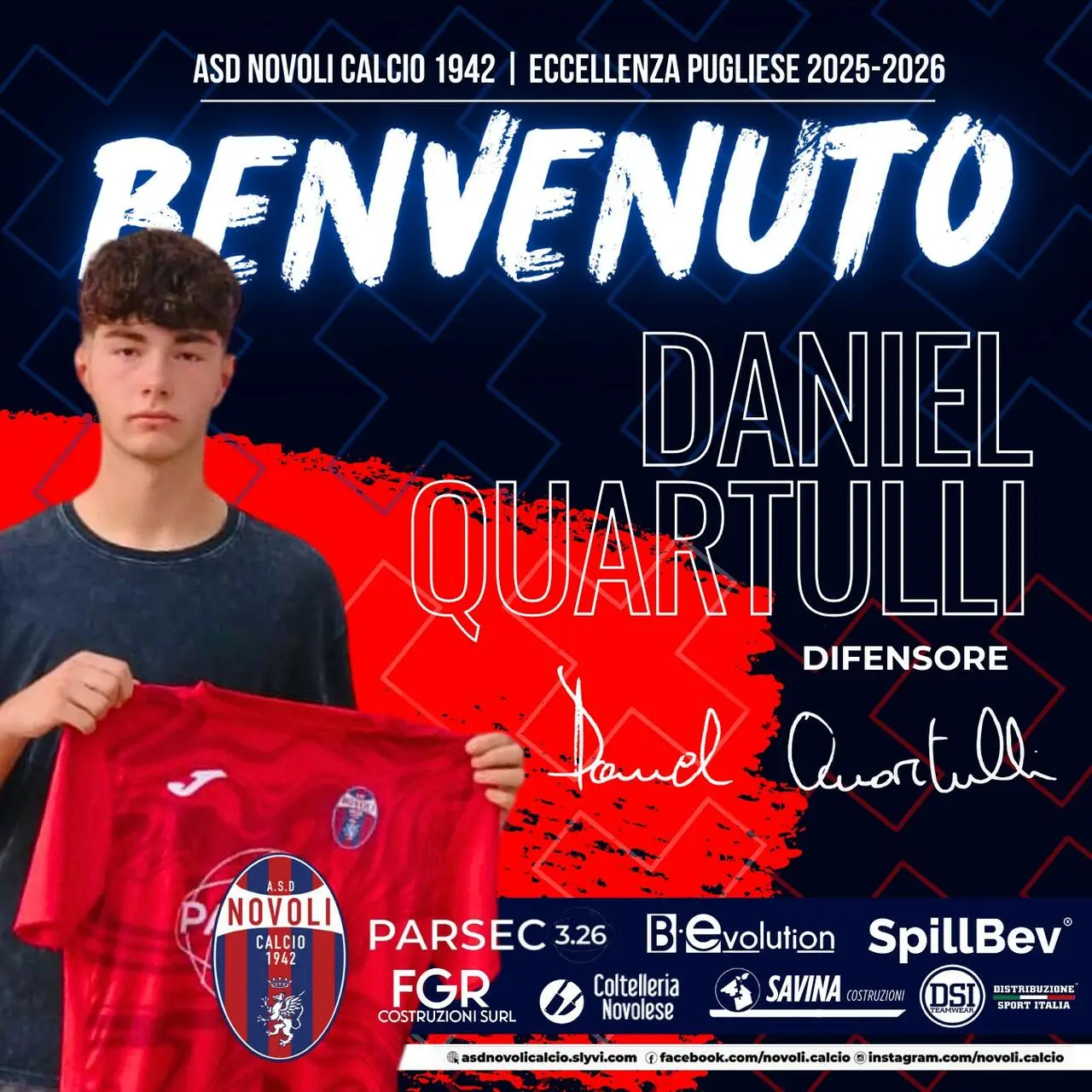 Ulteriore innesto nel parco under, per il Novoli di mister Luperto. Il volto nuovo è quello di 𝑫𝒂𝒏𝒊𝒆𝒍 𝑸𝒖𝒂𝒓𝒕𝒖𝒍𝒍𝒊, terzino sinistro classe 2007, impegnato nell'ultima stagione con la Virtus Matino (Promozione Pugliese). Cresciuto calcisticamente in settori giovanili di qualità, come Nitor Brindisi e Marino Academy, è pronto per vivere il campionato di Eccellenza Pugliese da protagonista.