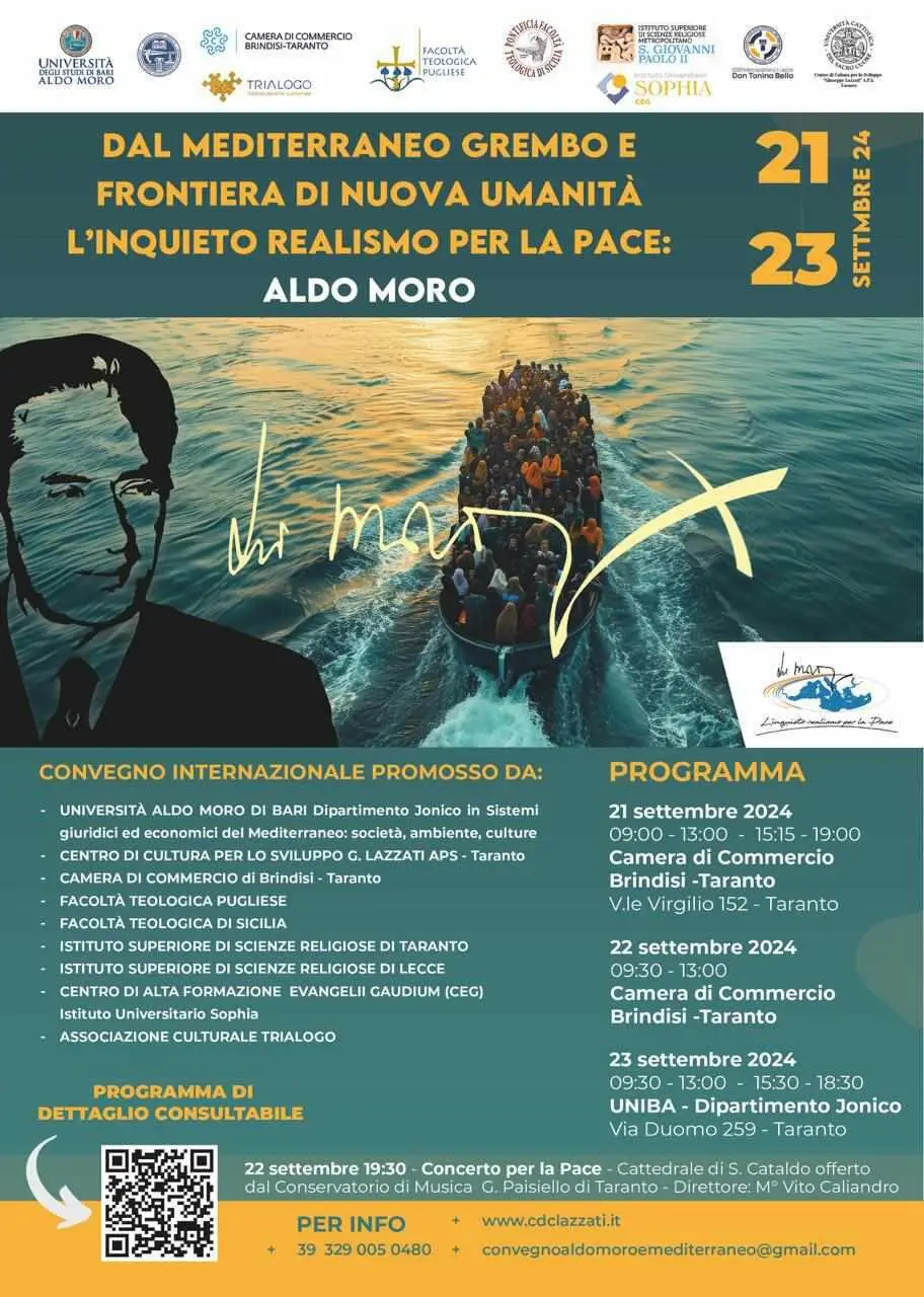Tutto pronto per il convegno “DAL MEDITERRANEO GREMBO E FRONTIERA DI NUOVA UMANITA’. L’INQUIETO REALISMO PER LA PACE: ALDO MORO”, che si terrà a Taranto dal 21 al 23 settembre. Nel corso della tre giorni si susseguiranno dissertazioni, confronti, un concerto, una tavola rotonda. Molta attenzione è nell’ambito istituzionale, sarà presente il Sindaco e Presidente della Provincia Rinaldo Melucci ed ecclesiale nelle sue Istituzioni, compresa la presenza dell’Arcivescovo mons. Ciro Miniero.