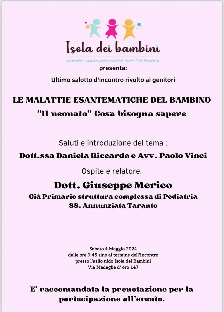Sabato 4 maggio a partire dalle ore 9:45 presso l’asilo nido “Isola dei Bambini” si terrà l’ultimo salotto d’incontro rivolto ai genitori questa volta intitolato “Le malattie esantematiche del bambino – Il neonato Cosa bisogna sapere”. Ospite e relatore dell’incontro sarà il Dottor Giuseppe Merico Già Primario della Struttura complessa di Pediatria dell’ospedale SS. Annunziata di Taranto.