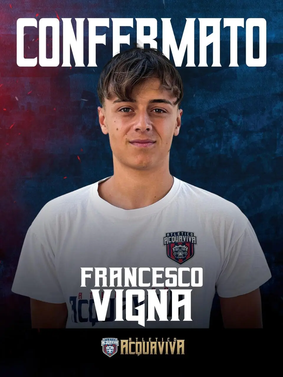 Francesco Vigna confermato per il 2025/26! Attaccante esterno classe 2006, arrivato dal Martina (Serie D) dopo 14 reti con la Juniores Nazionale e la convocazione alla Juniores Cup 2024. Cresciuto tra La Quercia Putignano, Conversano, Monopoli, Virtus Francavilla, Levante Azzurro, Esperia e Martina 1947.