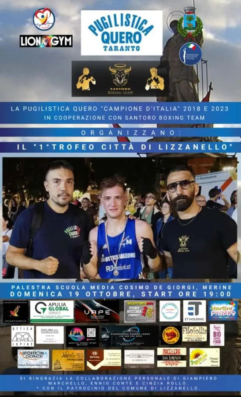 La città di Lizzanello nella provincia leccese aprirà questa domenica 19 ottobre le porte alla boxe, ospitando nella palestra della scuola media “Cosimo De Giorgi” - Merine, il 1^trofeo Città di Lizzanello, nato dalla collaborazione tra la Quero-Chiloiro e il Team del professionsita Antonio Santoro. Un connubio pugilistico, quello tra Quero e Santoro, che nasce da una profonda amicizia nata dal 1997, quando Cataldo Quero e Antonio Santoro avviavano la loro carriera agonistica, da dilettanti trovandosi anche avversari sul ring, poi compagni di squadra con la maglia azzurra, e nel 2000, contemporaneamente per diverse categorie di peso, campioni italiani junior. Protagonista di questa collaborazione, sarà però il figlio d'arte Nicolas Santoro, che combatterà nel match clou della manifestazione sportiva del 19 ottobre, dispuntando un incontro negli élite 60 kg dopo una serie di recenti vittorie che hanno portato il suo record a 7 match vinti e 2 persi, in uno scenario di crescita atletica per il giovane boxeur che promette bene per il futuro.