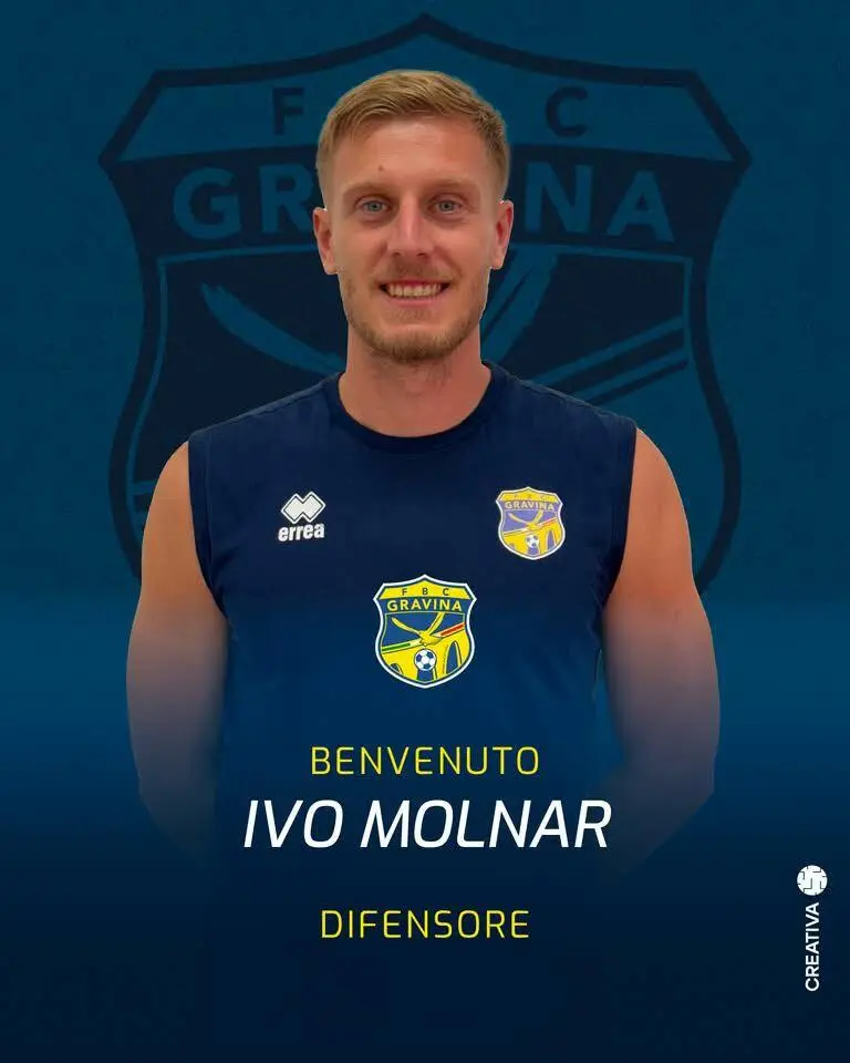 La FBC Gravina comunica l’acquisizione delle prestazioni sportive del calciatore Ivo Molnar. Nato a Rijeka (Croazia), possente difensore classe 1994, Molnar, cresciuto nel settore giovanile dell’Inter, si è affermato calcisticamente in Italia tra le fila del Voghera in D, poi nell’Olginatese, Castiglione, Monza, Dro e Pro Patria con cui ha effettuato il salto di categoria in serie C. Successivamente tra i professionisti si è distinto con le maglie di Arzignano, Virtus Francavilla e Caldiero Terme, totalizzando oltre 100 presenze. Arrivato a Gravina negli scorsi giorni, è a disposizione di mister Ragno in vista della gara di coppa Italia di domenica al Vicino contro la Scafatese.