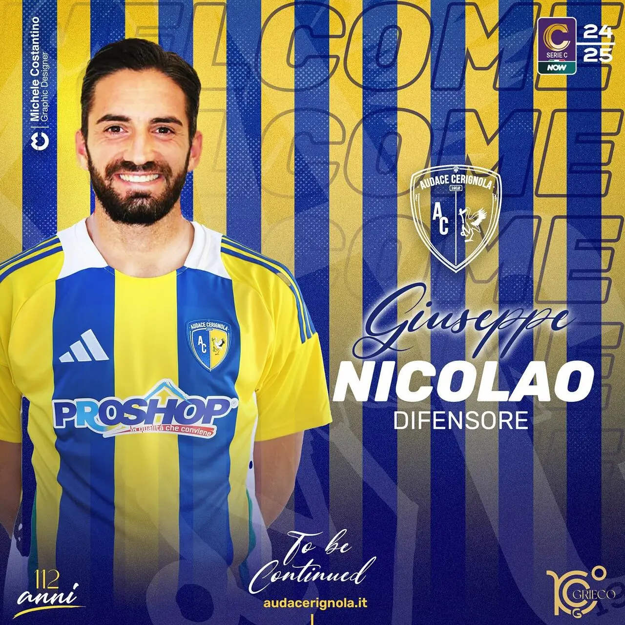 Giuseppe Nicolao firma con l'Audace Cerignola. Il difensore arriva dalla Turris, società che lascia a titolo definitivo per unirsi alla squadra pugliese dopo le 29 presenze dell'esperienza in Campania.