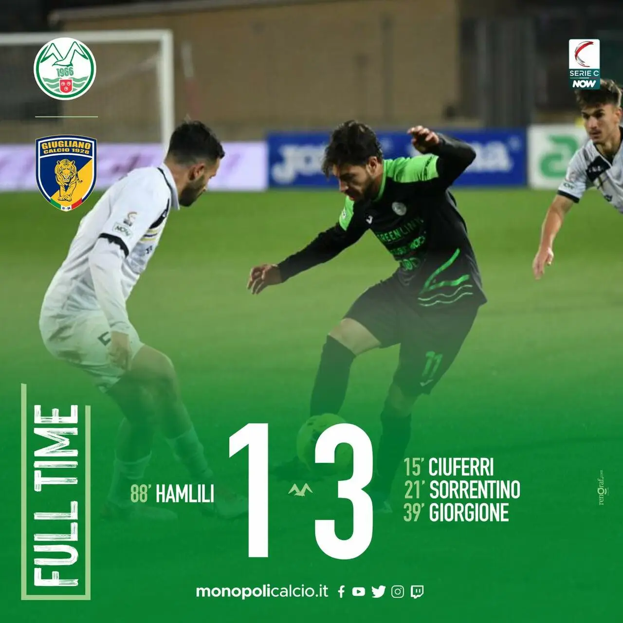 Note: Recupero 0’ p.t., 4’ s.t.; angoli 8-3. Divisa neroverde per il Monopoli, bianca per il Giugliano. Spettatori 2019 di cui 1356 abbonati e 42 ospiti.